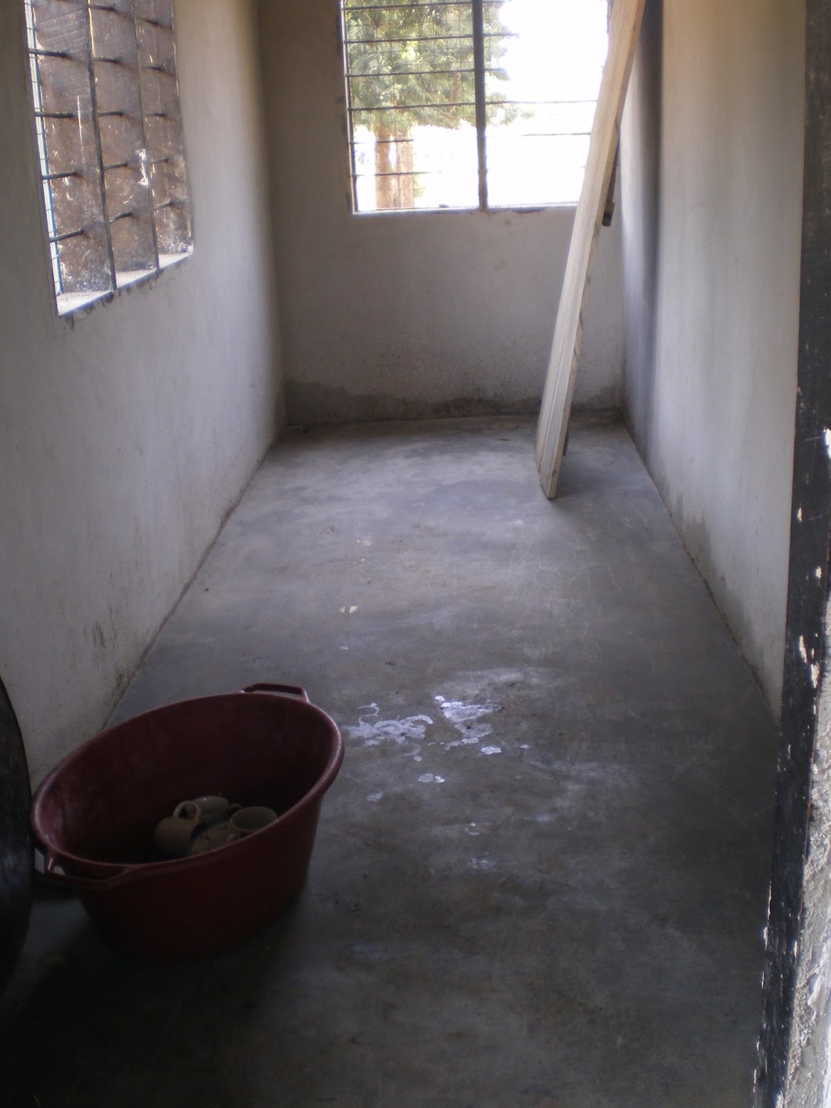 | Mpishi akiwa jikoni (The cook in the kitchen) sakafu imekamilika bado jiko litakarabatiwa karibuni kubana matumizi ya kuni |